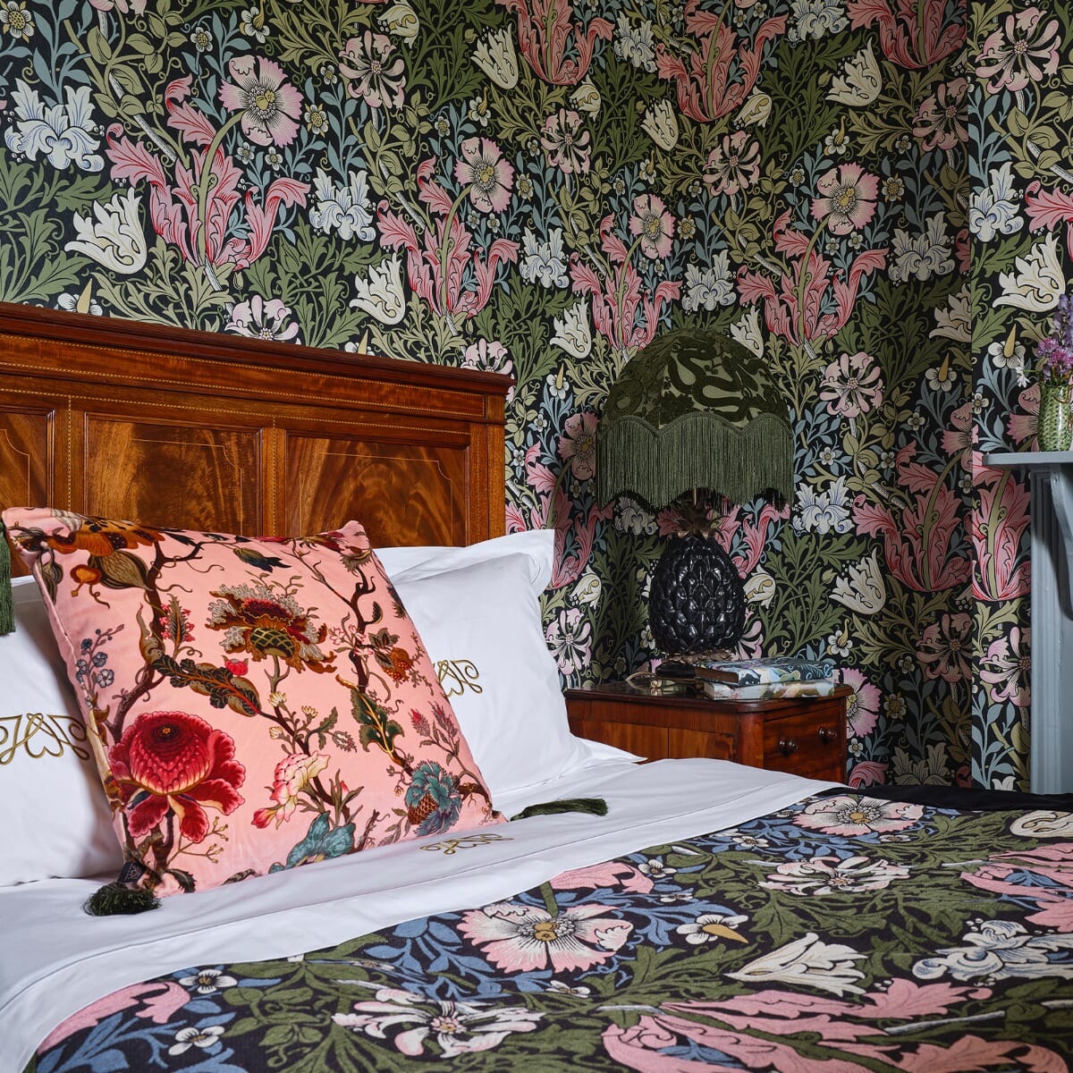 Painterly floral design in blush pink velvet, inspired by Diana Vreeland's iconic 'Garden in Hell' aesthetic. Soft pink tones blend with intricate botanical motifs, creating a rich, vibrant cushion with unexpected olive-green tassels at each corner. The luxurious British velvet base captures a delicate balance between classic elegance and contemporary flair, offering a striking visual statement for any interior space. Crafted with meticulous attention to detail, the cushion brings a sophisticated touch of artistic expression to sofas, armchairs, or bedding. Each cushion is filled with traceable wool from The Woolkeepers, ensuring premium quality and thoughtful craftsmanship. The delicate floral pattern and blush pink hue provide a subtle yet impactful design element that complements various colour palettes and decor styles. Hand-finished with refined olive-green tassels that add a playful, unexpected twist to the classic velvet texture.