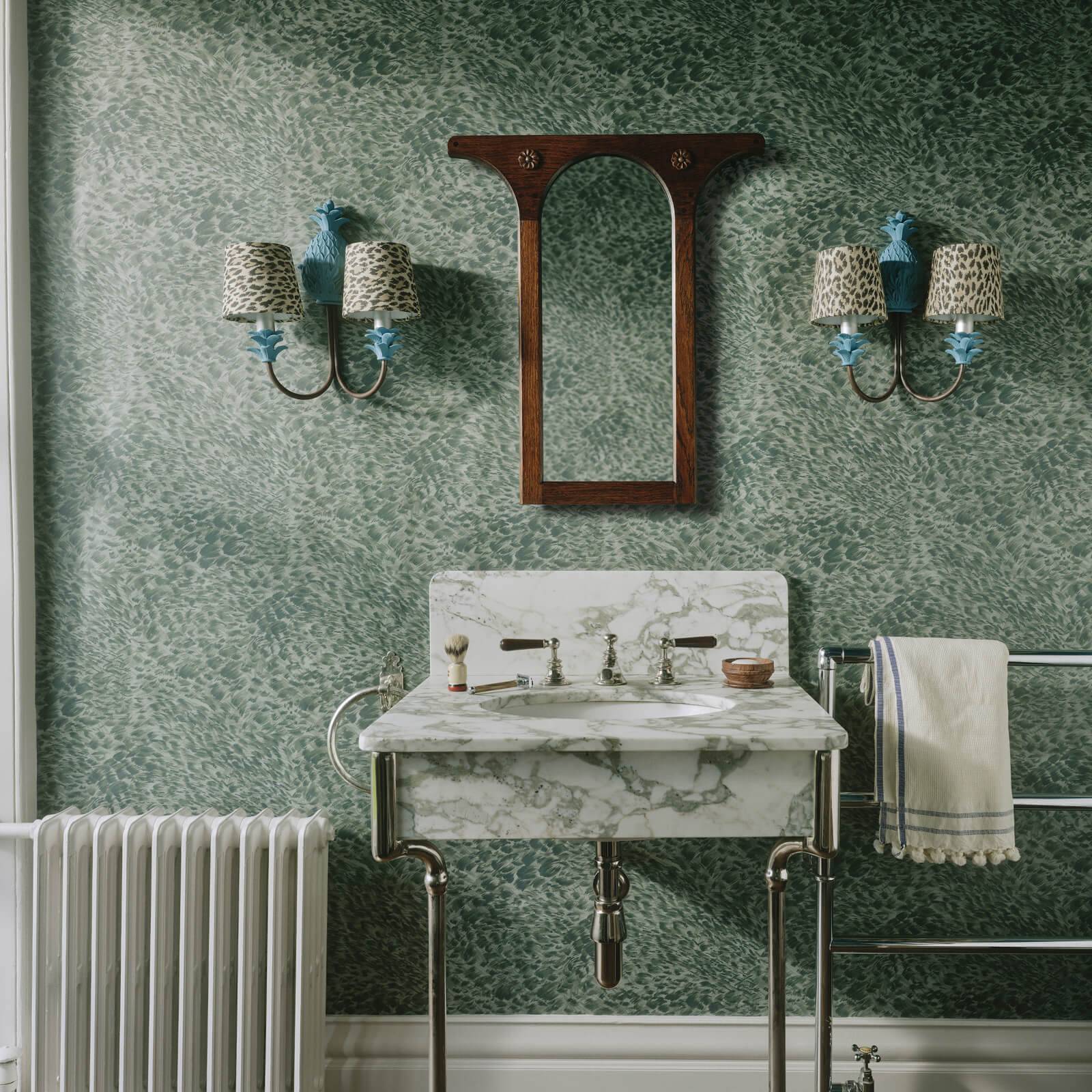 A confident choice for statement spaces in blue lynx print. Balancing colour and texture, it’s designed to feel impactful but easy to live with. Made in collaboration with The Lynx, bring the artistry of the wild into your interiors with this hand-drawn animal print wallpaper. Enigmatic, rugged and instinctual, our elusive feline’s subtle nature shines through in this painterly print. Evocative of the mottled tufts and brush-like scruff of a coat made for snow and shadows, this understated cat-print in tranquil, chalky blue will imbue your space with the solace of the natural world; serene, soothing and gently untamed. With its soft colour palette and muted, textural pattern, this wallpaper is perfect for introducing animal print to your space. Our wallpaper is made using PVC-free, FSC certified, purposely grown materials, printed with water-based, environmentally safe inks and is made especially to order, reducing waste. Welcome the wild into your home with our luxury animal print wallpaper in an earthy, teal blue hand-drawn design. Layer with complementary tones to create a confident, curated interior.