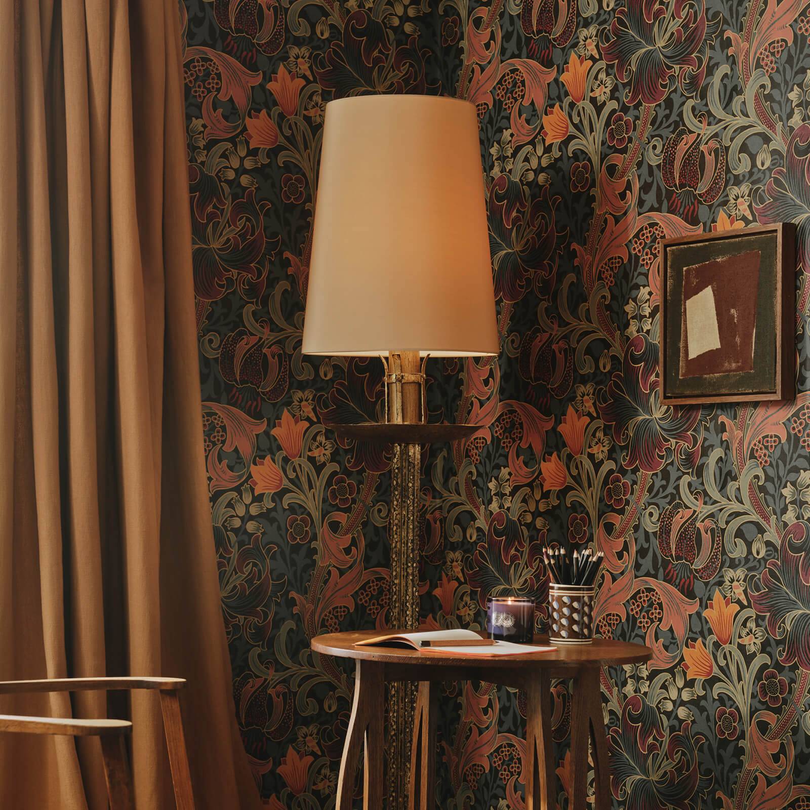 Soft sage green and deep purple intertwine in a classic William Morris-inspired lily pattern, creating a rich botanical narrative across this luxurious wallpaper. Delicate floral motifs wind gracefully, capturing the intricate hand-drawn essence of traditional English design with contemporary subtlety.