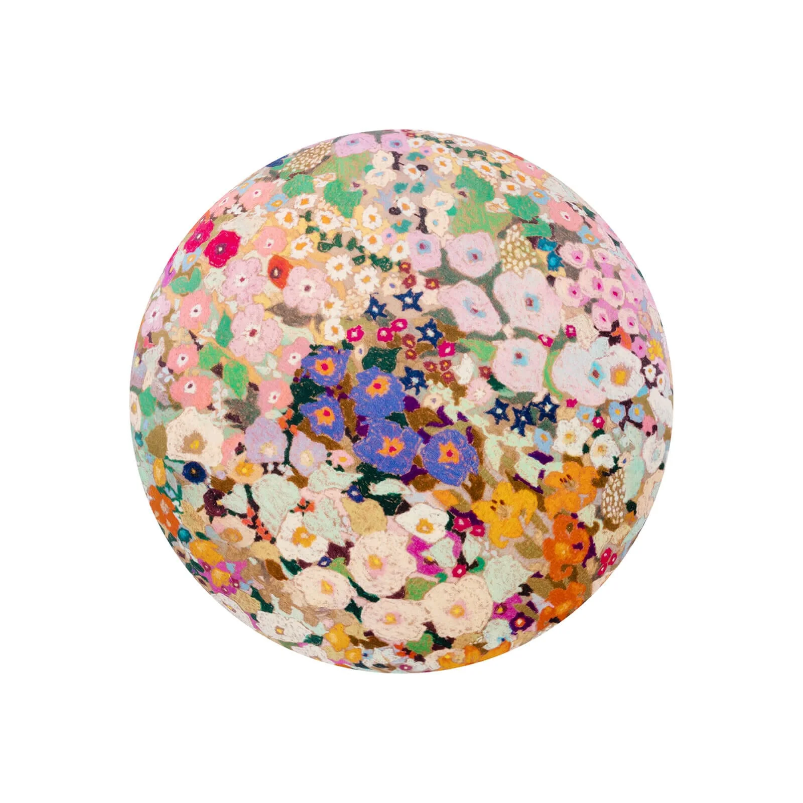 Pink, white, and yellow hollyhock spring florals printed onto luxurious cotton velvet, covering a rounded footstool with classic mid-century inspiration. Soft, plush velvet fabric captures delicate english country flowers in a vibrant botanical print. Perfect for adding natural charm to living spaces. Beautiful and useful seating solution crafted with meticulous attention to design details. Rounded silhouette provides comfortable resting space for feet or additional casual seating. W: 51cm x D: 51cm x H: 44cm.