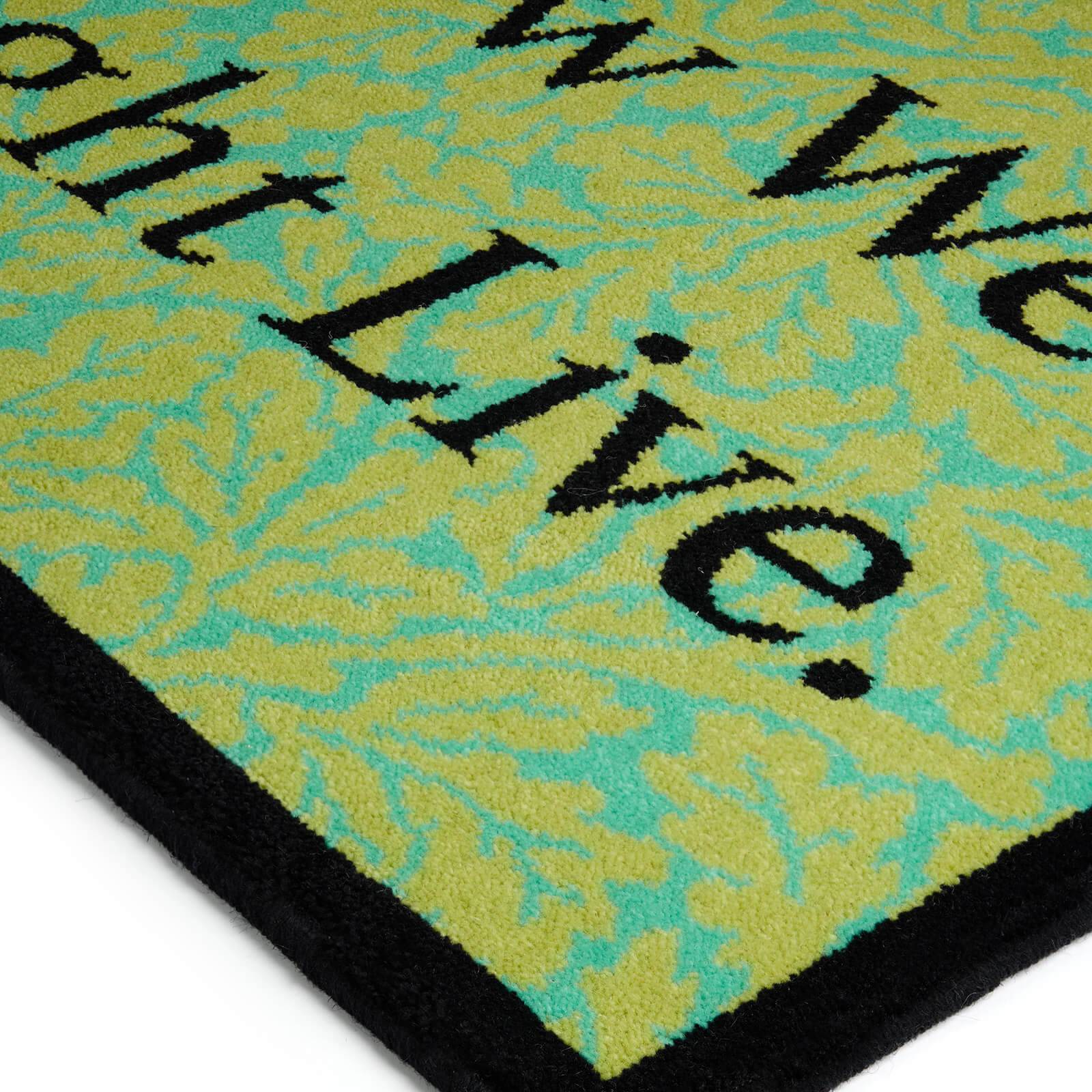 Bold chartreuse wool slogan doormat designed by artist Jeremy Deller, inspired by William Morris works. Vibrant green geometric pattern woven into a contemporary wool surface. Modern artistic design transforms entryway with dynamic visual energy. Striking abstract motif creates an impactful welcome statement for home entrances. Crafted from premium wool with crisp, clean lines that capture artistic imagination. Practical yet statement-making accessory for modern interiors.