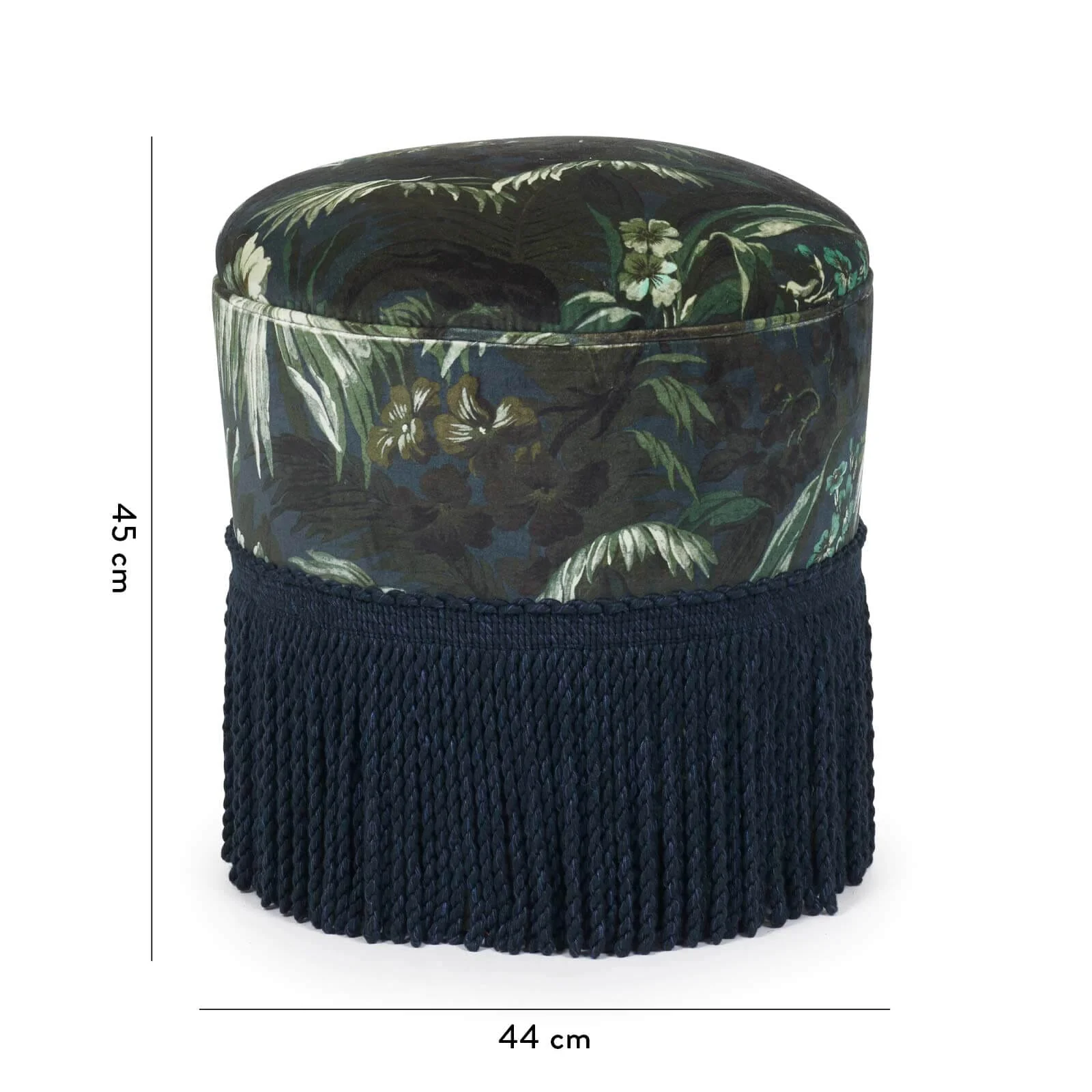Intricate foliage print in deep navy and ink tones printed onto luxurious navy velvet. Crafted as a compact footstool perfect for additional seating, this piece features soft velvet upholstery with a rich, detailed botanical design. Fringed edges add an elegant touch to the design, creating a beautiful and useful accent for any living space. Thoughtfully constructed with meticulous attention to detail, this velvet ottoman provides a sophisticated seating solution. Perfectly sized for versatile placement, the piece combines visual drama with practical function. Soft to the touch and visually striking, the footstool brings a refined botanical narrative to interior spaces. Soft velvet construction ensures comfort and durability. Dimensions W: 44cm x D: 44cm x H: 45cm.