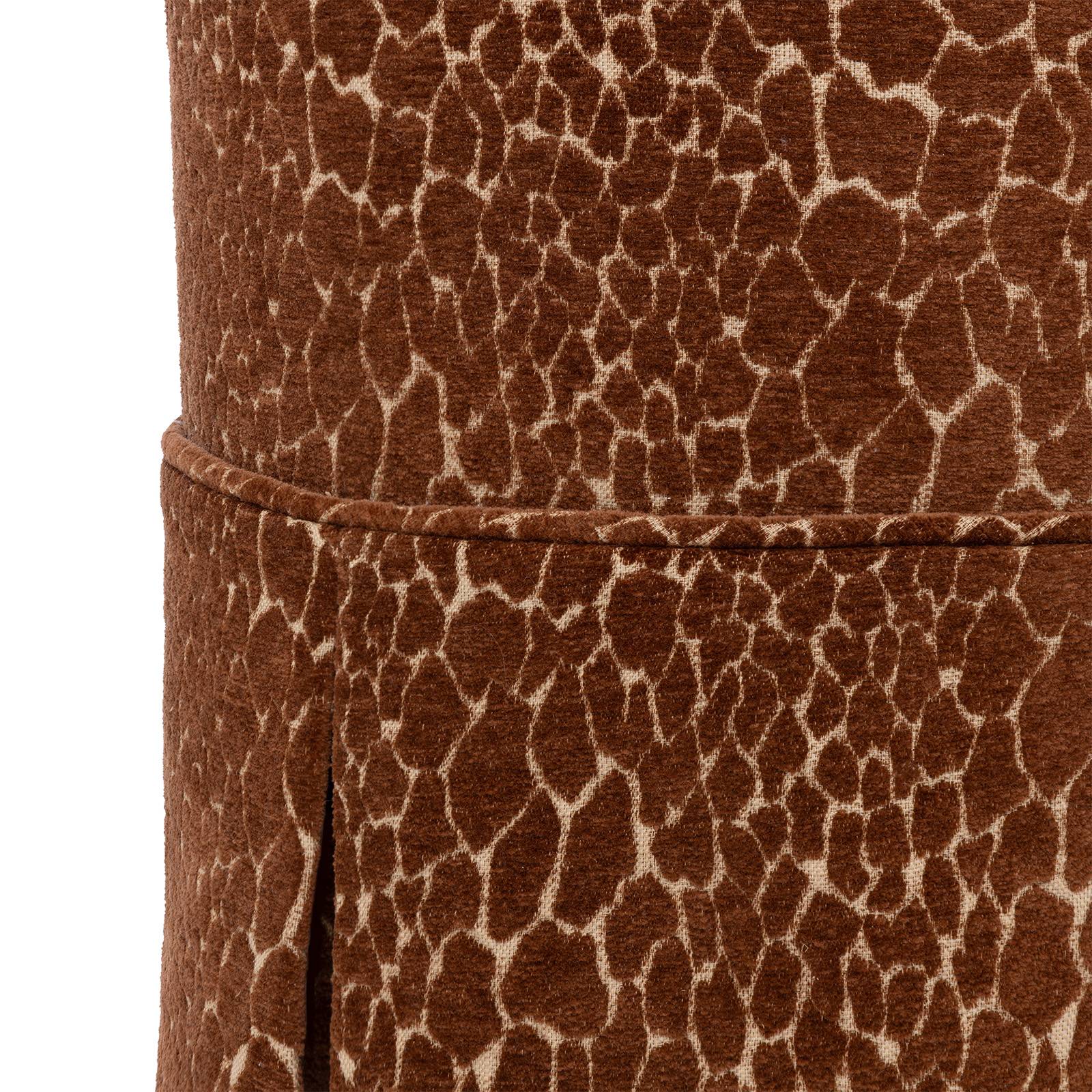 Create a focal point without the fuss in brown with a giraffe print. It brings instant depth to a scheme, whether you style it minimally or layer it up. Made in collaboration with The Giraffe, embrace the grandeur and gracefulness of the gentle giant with the MARA Pomona Bottoman. A piece with many personalities, our Bottomans are beautiful, useful, and made to last a lifetime. Footstool, vanity chair, side table or an ottoman to sit your bottom on, our versatile Pomona can be whatever you want it to be. Made in Britain, this piece is handcrafted with a beech wood frame and rounded, sleek skirted silhouette, before being swathed in rich, coppery, giraffe-print cotton-jaquard; sumptuously understated, and perfect for introducing a touch of the wild to your interiors. Elevate your interiors with this contemporary orange-brown animal print jacquard ottoman. Handcrafted from wood and upholstered in luxury giraffe print fabric, this timeless foot stool blends classic style and modern comfort. Style with warm neutrals and natural textures for an easy, balanced finish. Use it on a feature wall, in an alcove, or to add interest to smaller spaces.