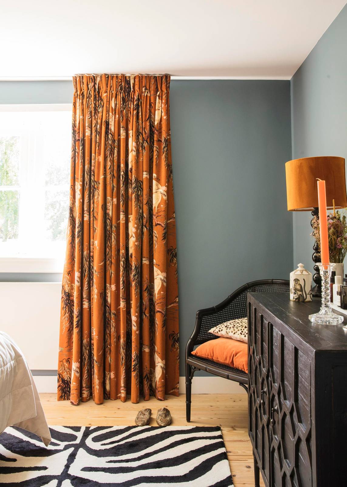 Subtle yet striking, the design balances organic movement with structured composition. Weeping willow branches and crane figures create a tranquil narrative, bringing a sense of calm and natural elegance to interior environments. Its rich colour and intricate pattern make it an exceptional choice for discerning designers and homeowners seeking unique textile solutions.